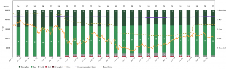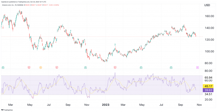 The Big Tech reports come at a time when US yields are pushing to 16-year highs and investors are slowly shying away from risk as tensions in the Middle East rise. Amazon’s share price has dropped in recent days after a failed attempt to rebound earlier this month. The Magnificent Seven are all facing increased bearish pressure as they have been thought of as the drivers of the 2023 stock market rally, which means many may view them as being overbought. That said, they are often viewed as safer investments by stock traders as they are deemed as “too big to fail” and therefore they may attract value investors in these times of uncertainty. As mentioned above, analyst consensus is for the stock to rise towards $170 over the coming months.