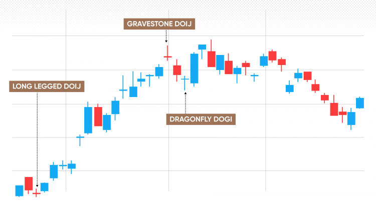 A doji is a candlestick where the opening and closing prices are equal, and it represents a fair amount of market movement over the course of a time period, but with a return to somewhere very close to the initial price. There are three types of doji distinguished by traders: