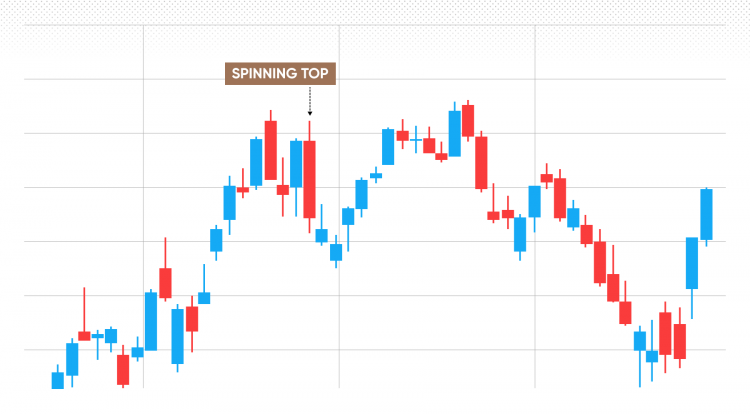 A spinning top is a kind of candlestick pattern similar to a doji. A spinning top looks a bit like a doji but, as a rule, its main body is a bit larger than a doji’s. Also, spinning tops tend to have heads and tails of similar lengths.