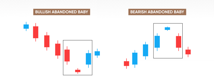 The abandoned baby candlestick pattern, sometimes known as the island reversal, comes in two forms, bullish and bearish.Either way, its appearance will be the same, with two, for want of a better word, regular candlesticks with a doji between them.