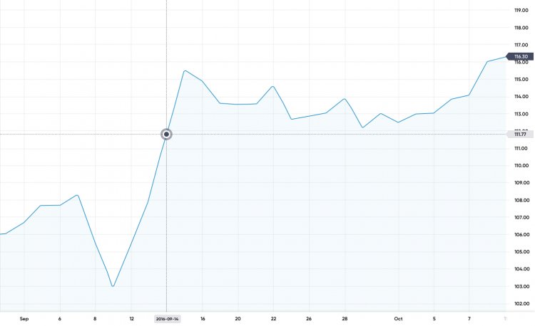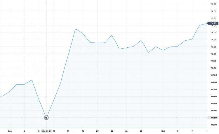 Opening your position: Your broker offers you an opening position of $103 on September 9 and you decide to buy 100 CFDs. At 100% margin, you’d have to deposit (100 x $103) = $10,300, plus a commission charge for transaction costs – maybe 0.1% ($10.30). There may be other costs involved, such as overnight financing charges. Remember to look carefully at the full costs of your transactions before you enter.