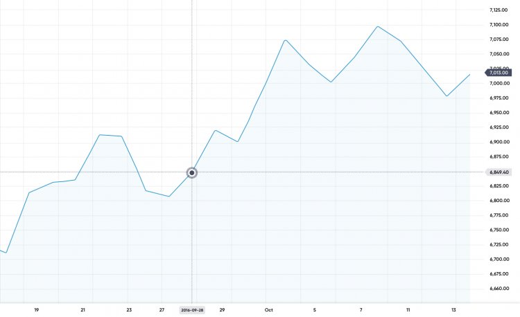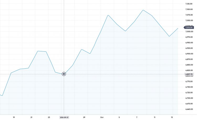 Opening your position: Your broker offers you an opening position of $6,807.7 on September 27 and you decide to buy 10 CFDs, which at 100% margin would cost a whopping $68,070. You pay 5 per cent margin (10 x 6,807.7 x 0.005) = $340.39