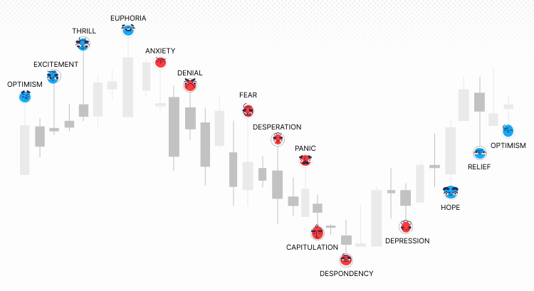 While the emotional spectrum of a human being can be vast and deep, traders typically distinguish 14 key trading emotions. These usually come in cycles, from excitement and euphoria, to fear and panic, and then despondency and depression.