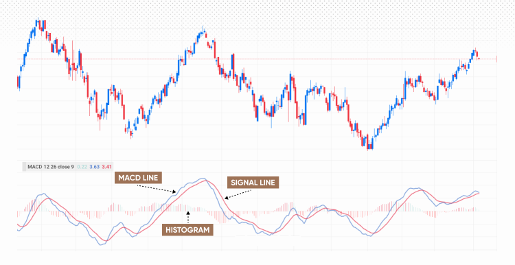 Histogram: The difference between the MACD line and the signal line, oscillating around a zero line.