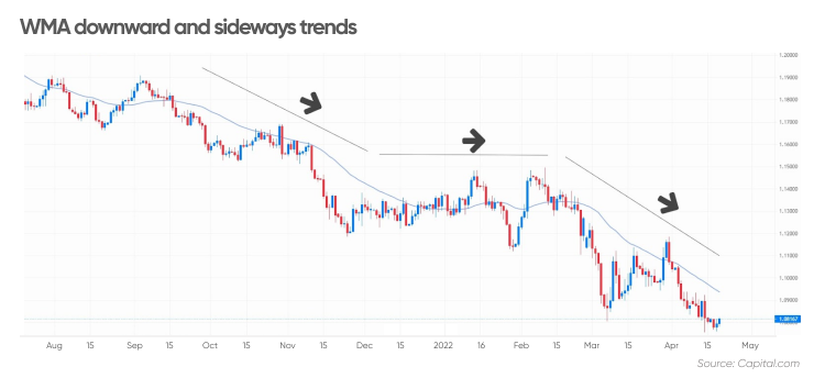When the WMA line on the chart is pointing higher, it indicates an uptrend. Accordingly, when a WMA line is pointing downwards, it indicates a downtrend. If the WMA line is flat, it shows there is a sideways trend.