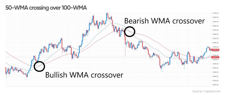 There are multiple ways traders can interpret the WMA. For example, identifying trend direction and strength, or the likelihood of a trend reversal.