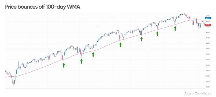 WMAs don’t typically work as reliably as the weighted moving average forecasting example below, where a months-long uptrend was supported by the 100-day WMA, seeing the price bounce off it several times.