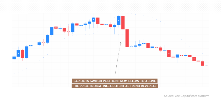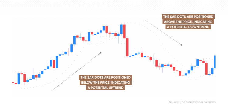 For instance, if the dots move from above the price to below it, it may suggest a trend reversal from bearish to bullish, whereas if the dots shift from below the price to above it, it may imply a reversal from bullish to bearish.