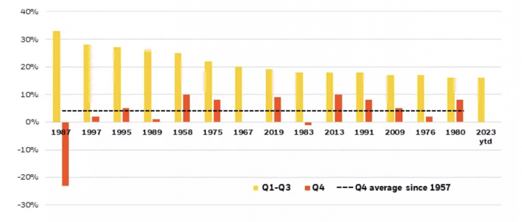 Forecasts are showing cautious optimism for the US stock market in Q4. The chart below – compiled by Blackrock Fundamental Equities – reveals that on average, the fourth quarter has seen an uptick of 4% in the S&P 500 index. And in those years where the first three quarters have seen a performance similar to (or above) the one we’ve seen so far this year, the general tendency is to see a positive performance in the last quarter of the year.