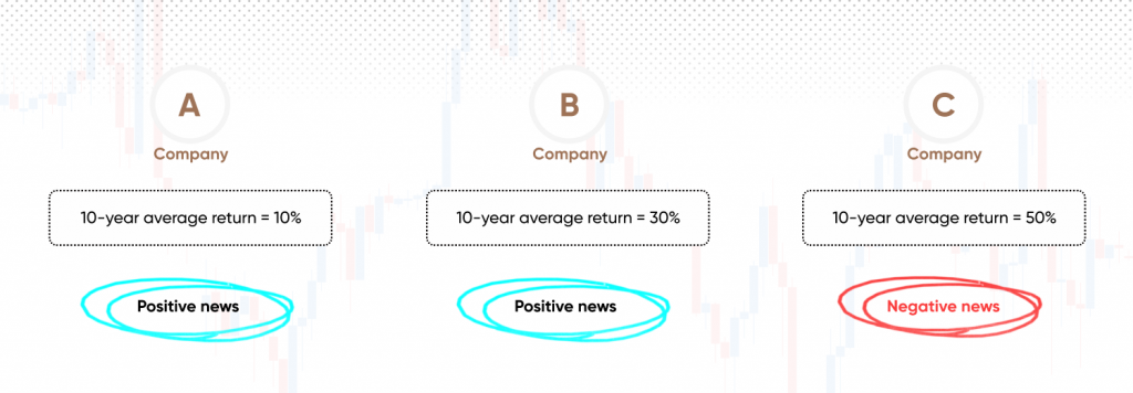 An intuitive choice could be the company with 50% return over the past decade. However, Christina decides to avoid this company as she learns that one of the group’s investors had recently put money into a firm that ended up going into bankruptcy.