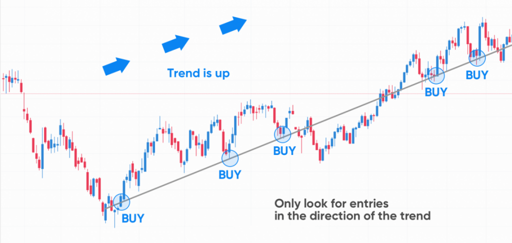 The trendline trading strategy suggests to use a trendline as either support a resistance. Traders simply draw a line, which connects several highs in a downtrend, or several lows in an uptrend. If the trend is strong, the price could bounce off the trendline and continue its movements in the trend’s direction. In this case traders pick up entry points in the direction of the trend.