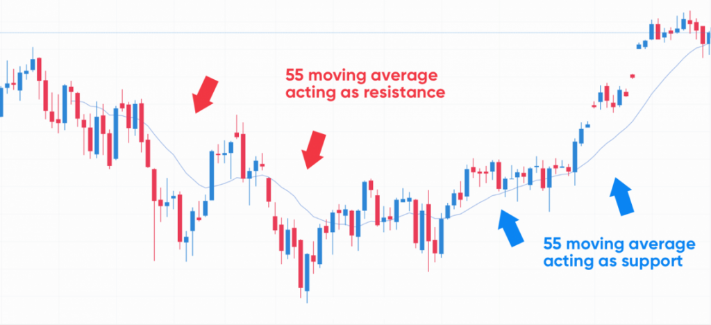 From the example above, you can see that the 55 MA initially stood above the market, representing the resistance line. When the market reversed, the 55 MA started acting like a dynamic level of support. These lines help traders to define, whether the market is likely to continue the current trend or is close to a breakout.