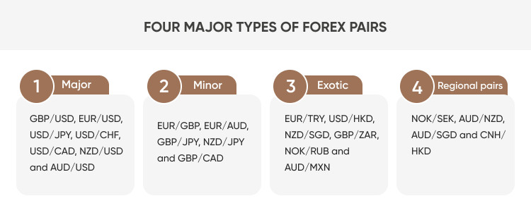 There are four main types of forex pairs that traders deal in, depending on their strategies: