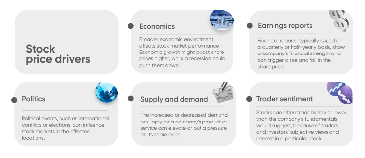There are several factors that could move share prices throughout a trading session and over time. These include fundamentals specific to the company such as revenues and profits, as well as external factors, like the macroeconomic climate and geopolitical concerns.
